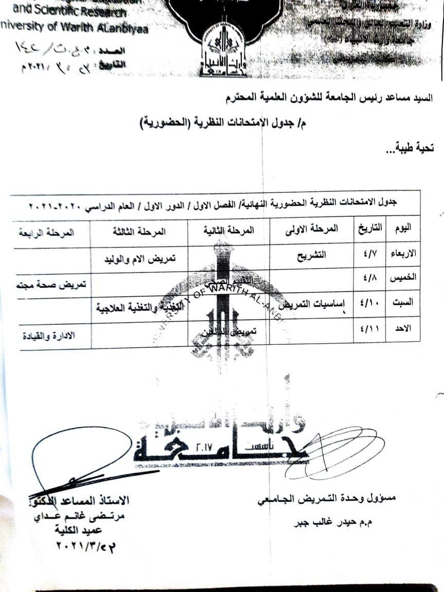 بعد مصادقة رئاسة جامعة وارث الانبياء (عليه السلام) على نتائج الطلبة للامتحانات النهائية للفصل الاول للعام الدراسي 2020-2021 .. تعلن عمادة كلية التمريض عن توزيع النتائج ولكافة المراحل الدراسية في مقر الكلية مع تمنياتها للطلبة بدوام التوفيق.
