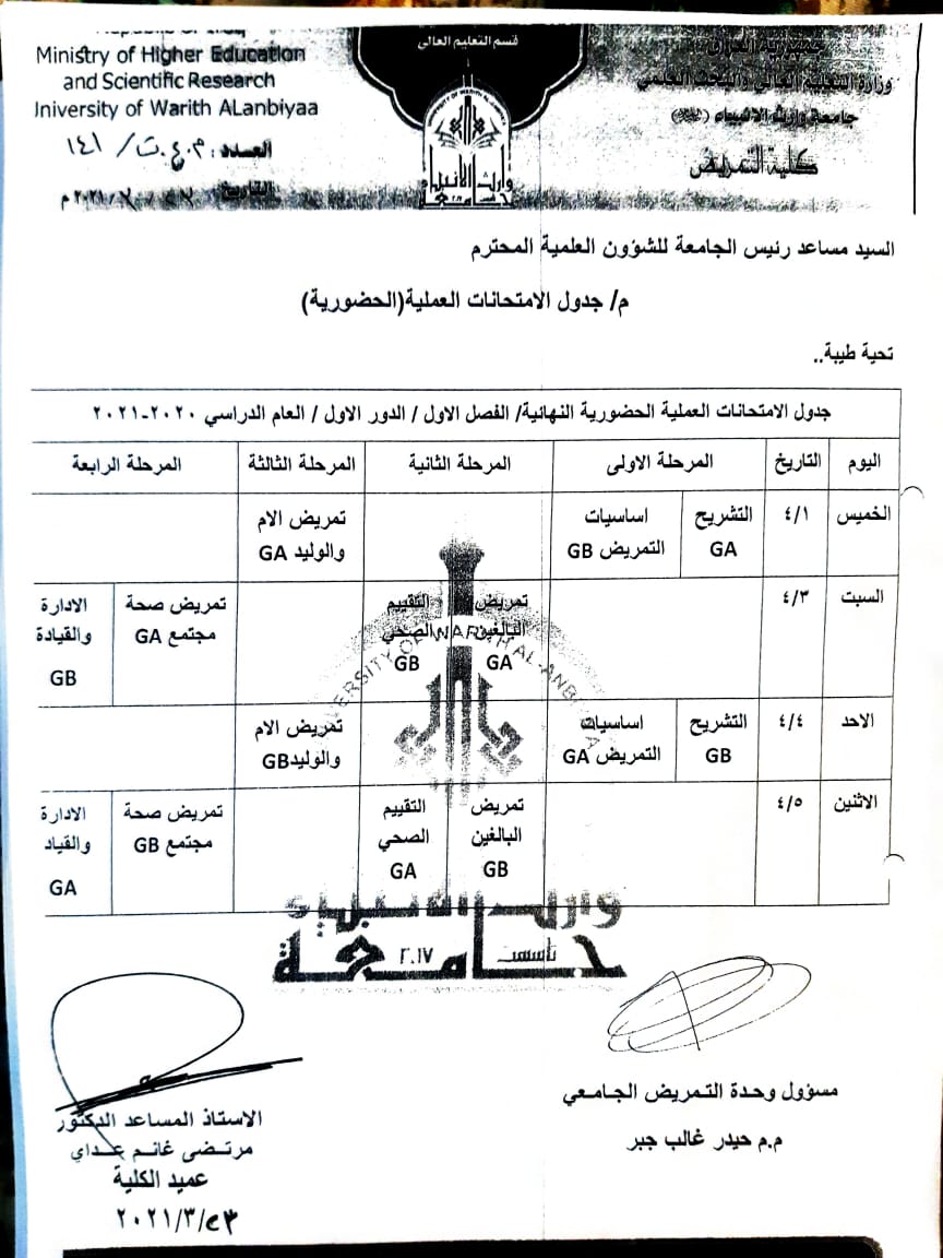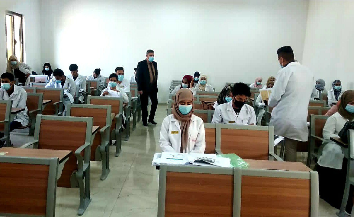 استمرار اختبار الطلبة في اسبوع الامتحانات النهائية العملية للمواد الاساسية في كلية التمريض مع اتخاذ كافة الاجراءات الوقائية اللازمة.