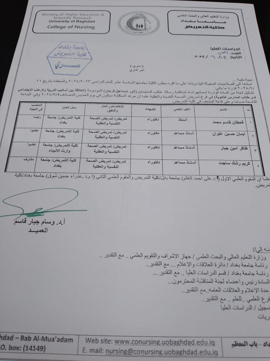شاركت عميد كلية العلوم بعضوية اللجان لمناقشة اطروحة دكتوراه