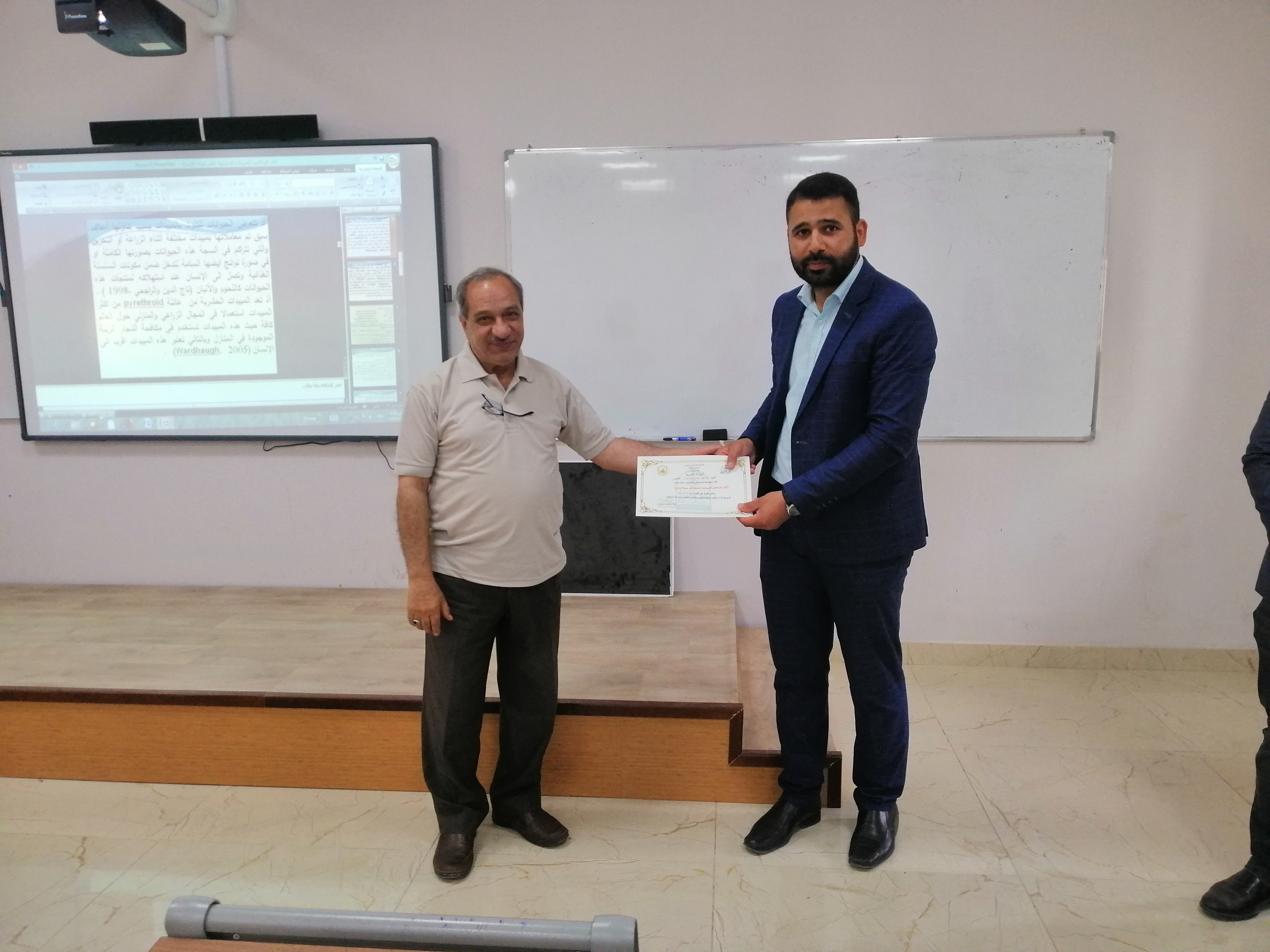 وفي الختام تم تكريم الاستاذ المحاضر بتوجية كتاب شكر وتقدير من قبل  مركز التعليم المستمر على يد أ.م.د.عدنان علوان الحلي / رئيس قسم العلوم الطبية.