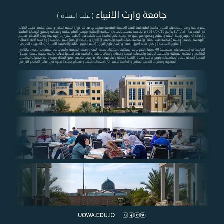 اختتم وفد جامعة وارث الانبياء (عليه السلام) مشاركته في معرض اكسبو دبي 2020 بحصيلة علمية وعلاقات دولية مع عدد من الجامعات العربية والعالمية. وتفقد السيد وزير التعليم العالي والبحث العلمي الأستاذ الدكتور نبيل صاحب الجناح المخصص لدولة العراق، والتقى وفد الجامعة وأشاد بالجامعات التابعة للعتبة الحسينية المقدسة، معتبراً تبني العتبة المقدسة لمشروع الجامعات هي تجربة متميزة في مجال التعليم.