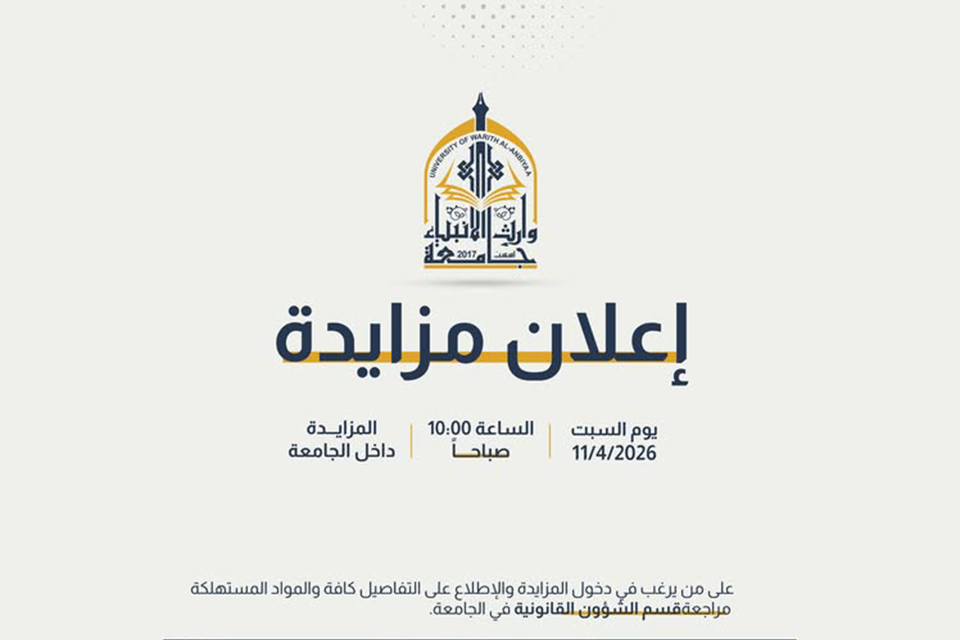 أعلنت جامعة وارث الأنبياء عن تنظيم مزايدة علنية لبيع المواد المستهلكة داخل الحرم الجامعي، وذلك يوم السبت الموافق 11 أبريل 2026 في تمام الساعة العاشرة صباحًا.