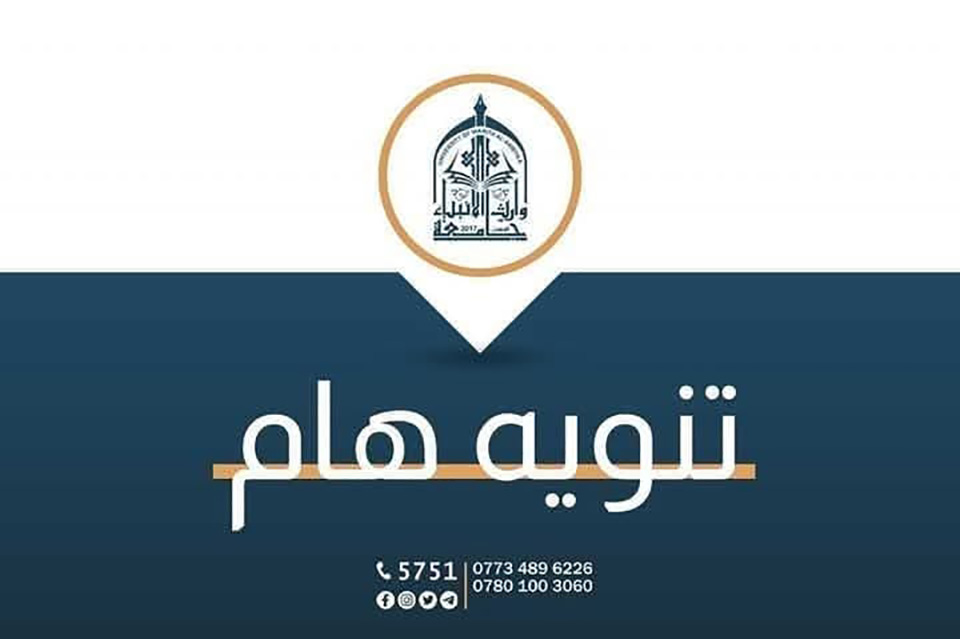 نرجو من طلبتنا الأعزاء الالتزام بالتعليمات والمواعيد المحددة لهم وفق الجدول الخاص بالكليات، مع ضرورة رفع الوثائق عبر تطبيق جامعة وارث الأنبياء.