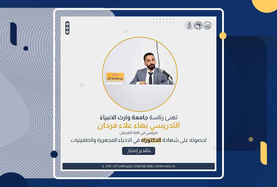 جامعة وارث الأنبياء تهنئ الدكتور بهاء علاء فرحان لحصوله على شهادة الدكتوراه