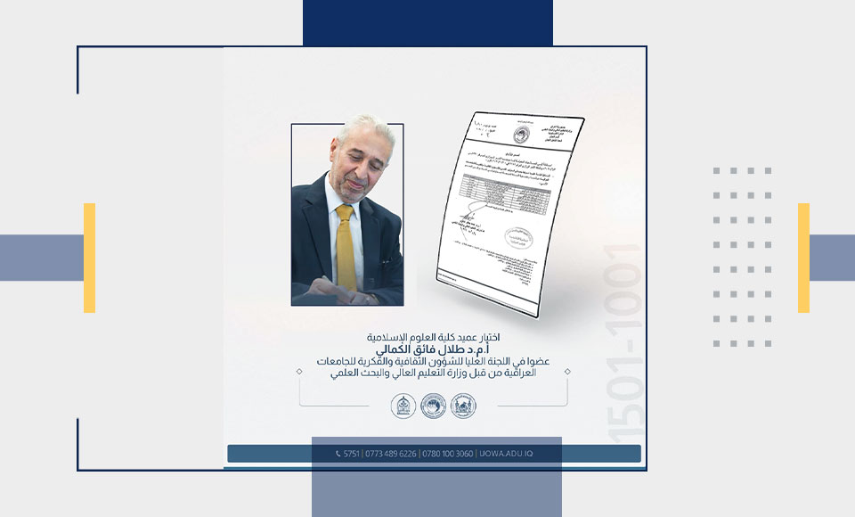 تم اختيار الأستاذ المساعد الدكتور طلال فائق الكمالي، عميد كلية العلوم الإسلامية في جامعة وارث الأنبياء (عليه السلام)، كأحد أعضاء اللجنة الوزارية العليا "للشؤون الثقافية والفكرية للجامعات".