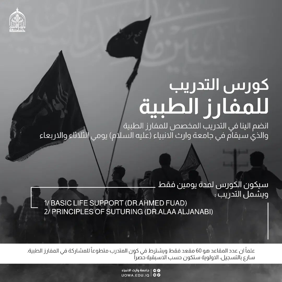 جامعة وارث الأنبياء (عليه السلام) تقييم (كورس تدريبي للمفارز الطبية) ولمدة يومين فقط في يومي الثلاثاء المصادف 18/7/2023 ويوم الأربعاء المصادف 19/7/2023 علما أن عدد المقاعد محدود جدا ما يقارب ٦٠ مقعد فقط, ويشترط في كون المتدرب متطوعاً للمشاركة في المفارز الطبية ويشمل التدريب: