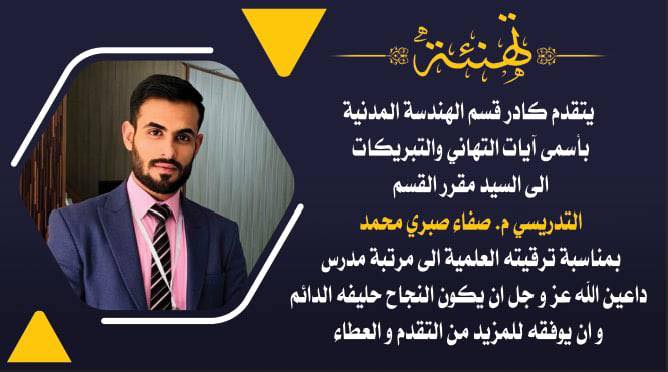 The Department of Civil Engineering, represented by the department head, Assistant Professor Dr. Ahmed Moussa Abdel Hadi, and the esteemed faculty members, extend their warm congratulations to the department's instructor, Mr. Safaa Sabri Mohammed, on the occasion of his academic promotion to the rank of "Lecturer." They pray for Allah, the Most High, to grant his success and prosperity in his academic journey.