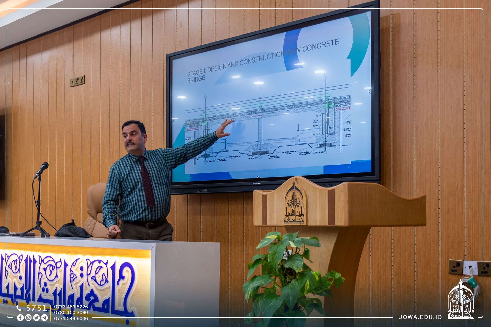 The Department of Civil Engineering, in collaboration with the Department of Scientific Affairs at the University of Warith Al-Anbiyaa (Peace Be Upon Him), organized a scientific seminar titled "Modern Construction Technology Using Hydraulic Jacks Systems Rapid Bridge Replacement on 5 Days Timelapse." The seminar was presented by Dr. Haitham Hassan Mutab Al-Daami, an expert in the design of steel structures and concrete facilities from the University of Babylon.