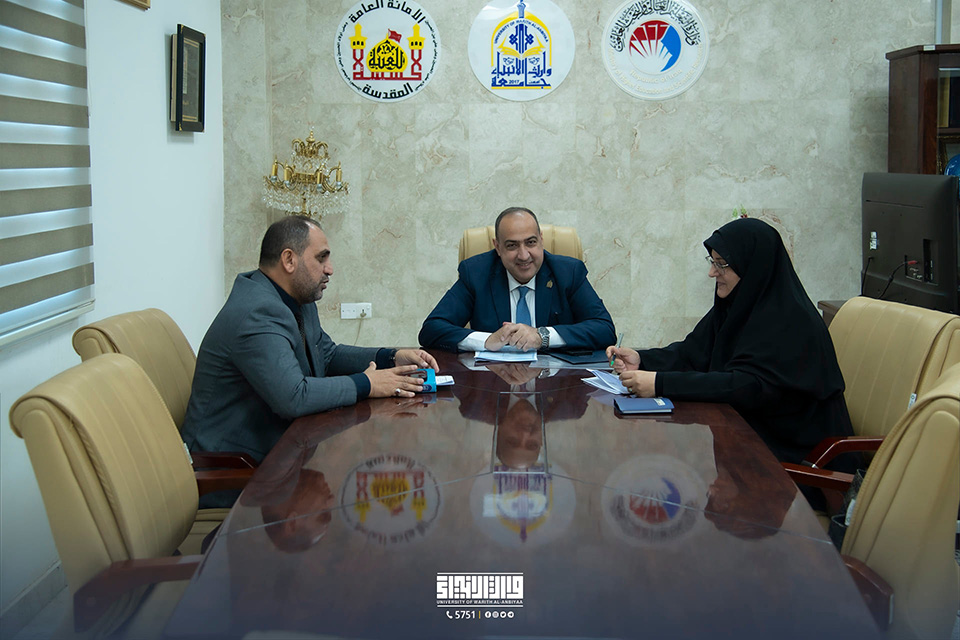 The University of Warith Al-Anbiyaa (PBUH) hosted a meeting between the presidents of the three universities affiliated with the Holy Shrine of Imam Hussain. Professor Dr. Ibrahim Saeed Al-Hayawi, the President of the University of Warith Al-Anbiyaa (PBUH), welcomed Professor Dr. Zainab Al-Sultani, the President of Al-Zahra University (PBUH) for Girls, and Professor Dr. Abbas Al-Daami, the President of the Technical Education Authority.
