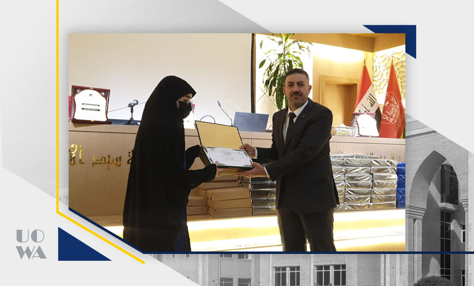 At a ceremony celebrating top students in Iraqi universities, the Women's Media Division at the Holy Shrine of Imam Hussein (PBUH) honoured the outstanding female students from the University of Warith Al-Anbiyaa (PBUH) as well as all the organisations and individuals who made this initiative a success. His Eminence Sheikh Abdul Mahdi Al-Karbalai (may his glory be long), the legal guardian of the Holy Shrine of Imam Hussein (PBUH), the president of the university, Professor Dr. Ibrahim Saeed al-Hayawi, and several other religious, scientific, and academic figures were present.