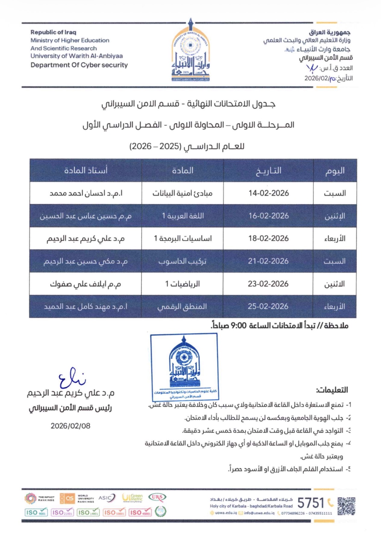 As part of efforts to enhance academic cooperation between public and private universities, the College of Computer Science and Information Technology at the University of Warith Al-Anbiyaa (peace be upon him) organized a joint examination for students of the Information Technology Department, in cooperation with the University of Karbala / College of Computer Science and Information Technology / Information Technology Department.