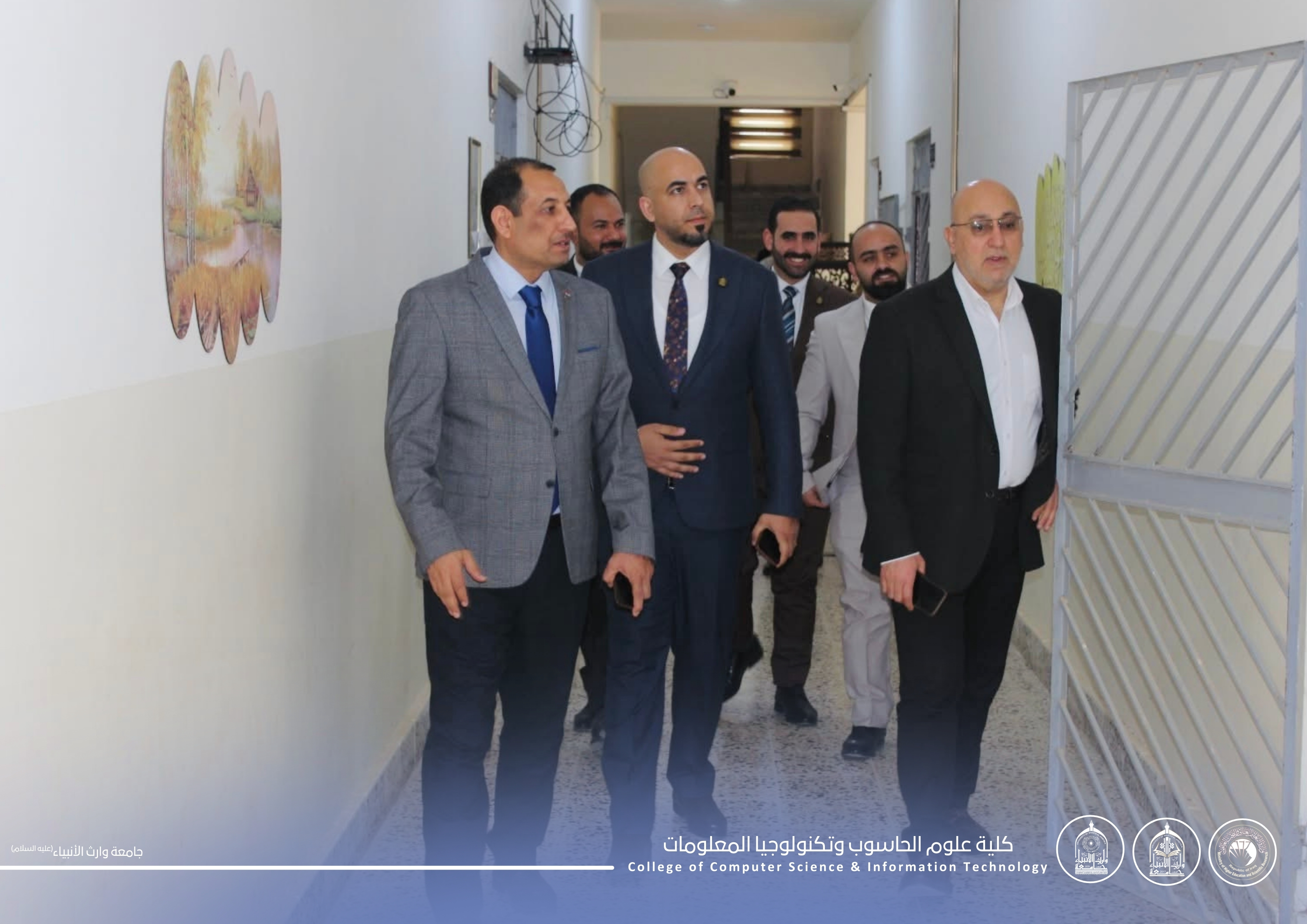 The Dean of the College of Computer Science and Information Technology, Assistant Professor Dr. Haider Mohammed Ali Al-Ghanami, received a high-level delegation from the College of Engineering – Warith Al-Anbiyaa University, headed by Assistant Professor Dr. Hussein Hadi Hussein, Dean of the College, accompanied by a group of faculty members.