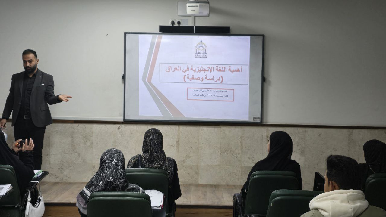 The College of Islamic Sciences held a scientific symposium titled "The Importance of the English Language in Iraq: A Descriptive Study," presented by Lecturer Mustafa Riyadh Al-Khafaji. The symposium explored the role of the English language in higher education, the job market, and international communication.