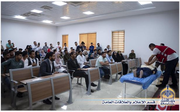 The Center for Continuous Education at the University of Warith Alanbiyaa (PBUH) organized, in coordination with the Iraqi Red Crescent Society, the branch of Karbala, a training workshop in first aid for the university employees and students. The workshop included training the participants on how to assist patients and the injuries in emergency cases and accidents.  Also, it included the training on what are the alternative situations before transferring the patient to the hospital in the first minutes of the infection, which included all the steps to be taken to deal with these cases in a simplified form and practical application. This is to facilitate learning and to behave wisely to avoid these issues such as the cases of (Suffocation, drowning, fire, and explosions) and the emergency cases such as unconsciousness. Additionally, it involved training on how to deal with each case differently from the other as well as training on the principles of first aid in the emergency cases as a result of what is exposed to our country and to the citizen in the daily life. Meanwhile, Mr. Samir Nizar Abd, a first aid trainer in the Crescent, said it is necessary to train everyone on first aid because it is the best way to save the lives of citizens in the first minutes of the incident, which is the golden minutes to save the life of the injured people.
