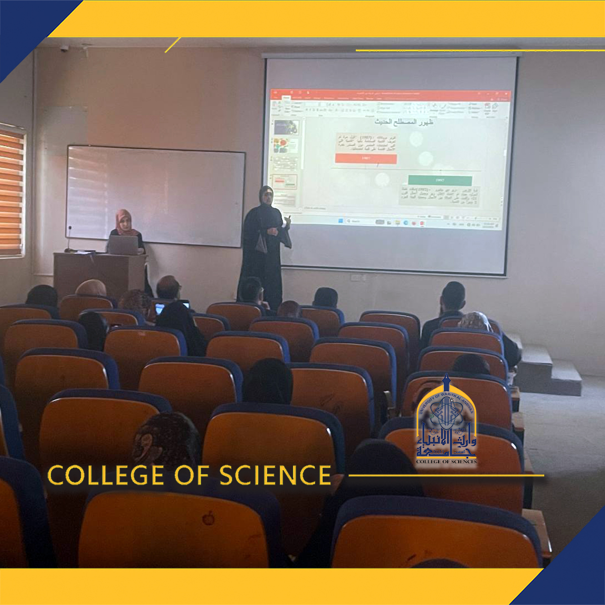 As part of the second axis of economic development for Iraqi women, the Women’s Affairs Unit at the College of Science, Al-Warith Al-Anbiyaa University, organized an educational seminar on “Empowering Iraqi Women in Sustainable Economic Development” on December 3, 2025. The seminar was delivered by Assistant Lecturers Ilaf Ali Safouk and Saja Basim.