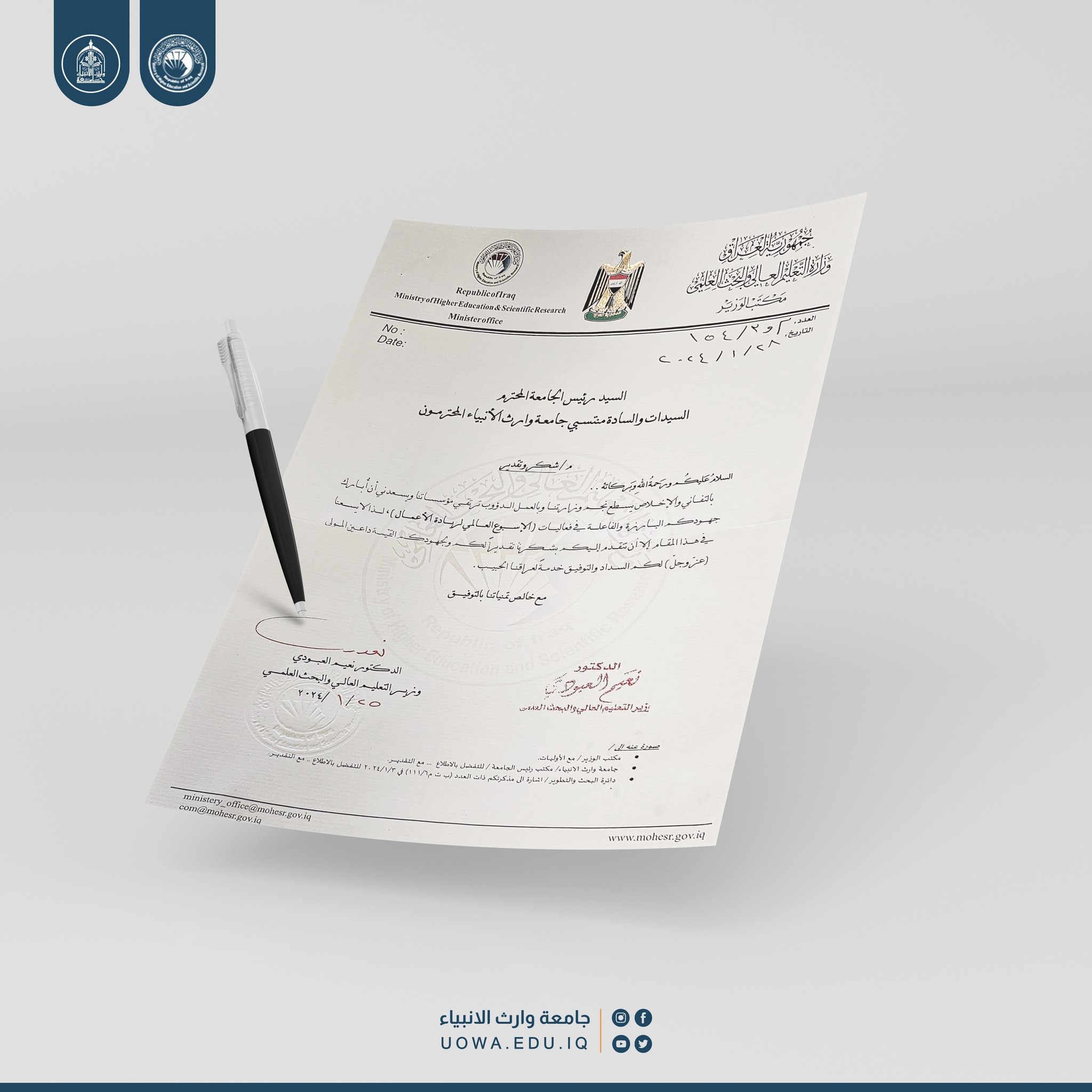 The Council of the University of Warith Al-Anbiyaa (peace be upon him) extends its heartfelt congratulations to His Excellency the Minister of Higher Education and Scientific Research, Dr. Naeem Al-Aboudi, and to the academic and scientific elites in our beloved country on the significant achievement.
