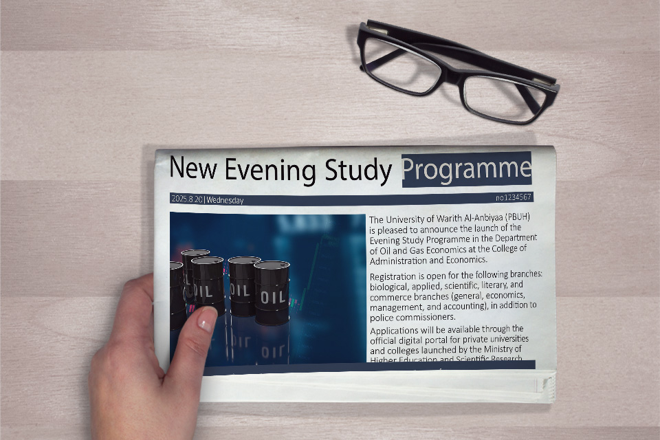 The University of Warith Al-Anbiyaa (PBUH) announced the introduction of evening study programmes in the Department of Oil and Gas Economics at the College of Administration and Economics, opening new opportunities for a wider segment of students interested in pursuing this vital specialisation.